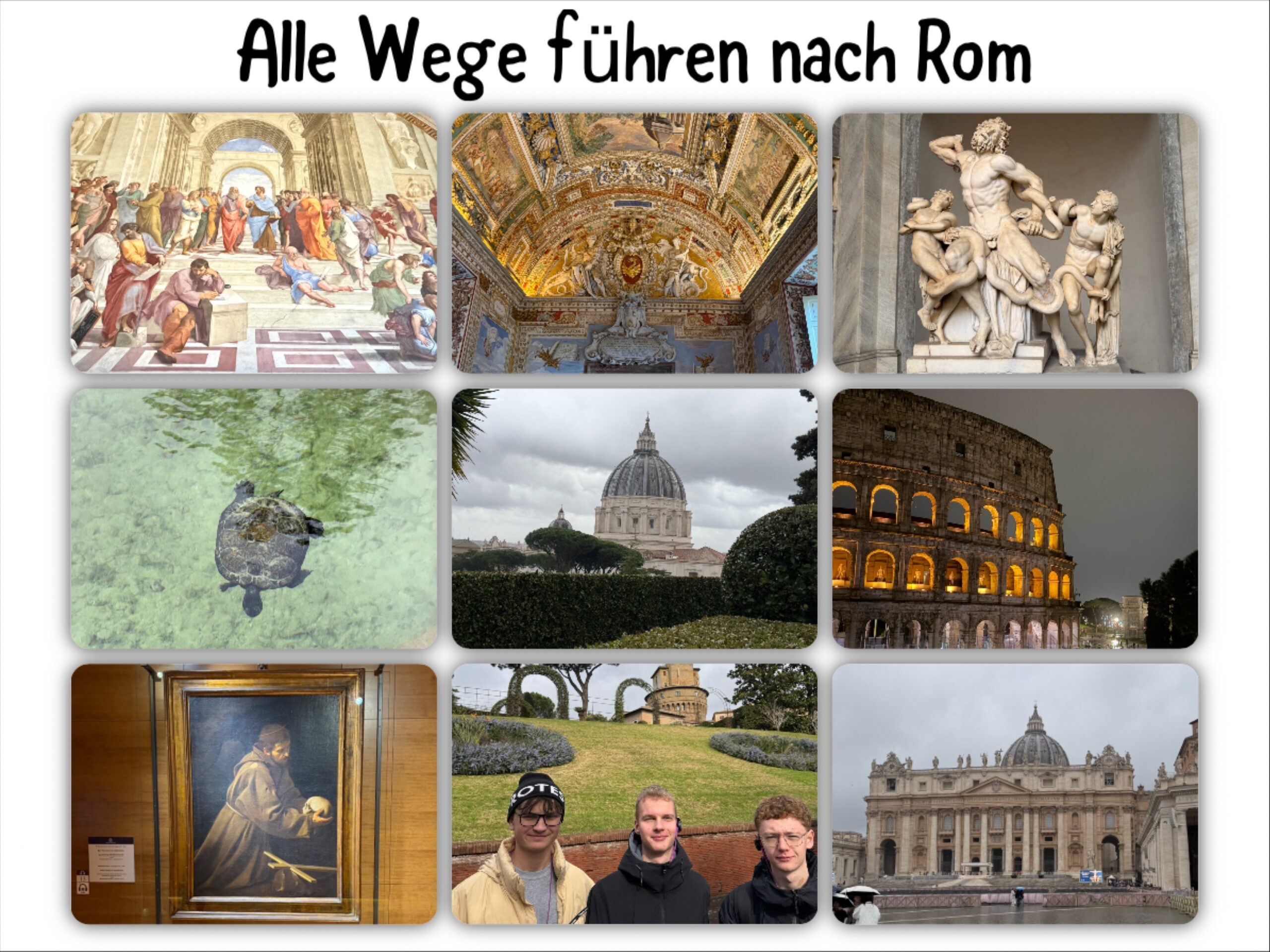 Danach ging es in die Museen selbst. Zuerst sahen wir die berühmte Laokoon-Gruppe, eine antike Skulptur, die den trojanischen Priester Laokoon und seine Söhne im Kampf mit Schlangen zeigt. Anschließend standen wir vor Raffaels Philosophen-Fresko „Die Schule von Athen“, auf dem die bedeutendsten Philosophen der Antike versammelt sind. Den Abschluss bildete die Sixtinische Kapelle mit der Deckenmalerei von Michelangelo. Ein Moment, der trotz der vielen Menschen erstaunlich still und beeindruckend war. Ars longa, vita brevis.