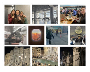 Fluchende Eltern, Koffer quetschen und Zeitdruck waren wahrscheinlich bei den meisten heute morgen Programm. Aber festina lente (lat. „Eile mit Weile“)! Also wurde der letzte Kaffeeschluck in Ruhe genossen, bevor es zum Flughafen nach Berlin ging. Doch plötzlich die erste schlechte Nachricht: Unser Flug hat fast eine Stunde Verspätung. Ob der Zeitplan für den restlichen Tag nun noch passt, wird sich zeigen. Zunächst hatten wir dadurch aber mehr als genug Zeit, um auf die Ankunft von jedem zu warten und unsere Koffer abzugeben. Nun kam der Moment in dem viele bangten, ob ihr Koffer nicht doch zu schwer sei, wie auch ich. Doch Quentin zeigte, dass es auch das Gegenteil gibt; sein Koffer war pluma ut levis („leicht wie eine Feder“) und somit schon zu leicht (!) für eine normale Abgabe. Nach Security Check und kostenintensiver Mittagspause war Zeit für das Boarding und unsere eigentliche Reise begann. Zwei Stunden schauten wir auf die vorbeiziehenden Wolken herab, bis sich vor uns die italienische Mittelmeerküste mit der Hafenstadt Ostia Antica zeigte. Die untergehende in Orangetönen gefärbte Sonne erstrahlte mit ihrem letzten Licht den fast wolkenlosen Himmel und bot einen ersten Einsruck des uns erwartenden Wetters. Doch nicht nur die Sonne, sondern auch Anna W. strahlte, da sie den Flug ohne große Angst überstanden hatte und nun mit ihrem Koffer, genau wie wir, vor dem Bus nach Rom stand. Als wir nach dem ganzen Reisen endlich in Rom unser Hotel erreicht hatten, waren alle erleichtert. Endlich hatten wir Zeit zum Essen und Ankommen. Jedoch nicht so lange, wie manche sich gewünscht hätten. Denn abends wartete noch der Trevi Brunnen und ein dazugehöriger Vortrag von Clara, den sie mit Bravour in Strömen von Menschen präsentierte. Auf dem Rückweg war die Erschöpfung uns ins Gesicht geschrieben und somit war unser restliches Abendprogramm nur noch Duschen, Umziehen und Schlafen mit der Aussicht auf einen weiteren erlebnisreichen Tag.