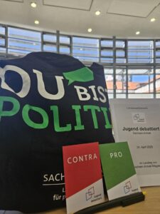 Am 28.04.2025 fand im Landtag Sachsen -Anhalts in Magdeburg der Landeswettbewerb „Jugend debattiert“ statt. Unser Gymnasium wurde in der SEK II von Leo Kain als Debattant vertreten. Den Landeswettbewerb „Jugend debattiert“ unterstützten Josephine Fiala und Laurenz Geppert als Juroren und Lenny Kiontke als Zeitnehmer.