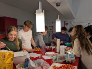 In Helsinki angekommen, wurden wir herzlich von einigen der Austauschschüler empfangen und mit dem PÜNKTLICHEN Zug nach Kerava begleitet. In der Schule in Kerava wurden wir von den restlichen Schülern bereits erwartet. Nach einer Stärkung mit dem Schulessen, was im Gegensatz zu Deutschland kostenlos ist und immer frisch und lecker war, bekamen wir eine persönlich geführte Tour durch die Schule. Diese unterscheidet sich enorm von unserer Schule, denn dort ist die Modernisierung und Digitalisierung deutlich weiter fortgeschritten als bei uns. Außerdem ist das Schulgebäude größer, besitzt ein eigenes Parkhaus und bietet viele Möglichkeiten, um in den Pausen oder während der Freiarbeit dort zu sitzen und mit seinen Freunden Zeit zu verbringen. In der Lehrerlounge begannen wir, passend zu unserem Thema „Food Culture“, verschiedene Spezialitäten zu backen. Während einige Teig rührten, mussten andere Schmerztabletten tauschen, denn ein paar von uns hatten das frühe Aufstehen wohl nicht so gut vertragen. Nachdem alles erledigt war und wir. die Kuchen genossen hatten, ging es auch schon nach Hause, um unsere Gastfamilien kennenzulernen. Den Abend konnten wir dann gemütlich genießen und anschließend unseren Schlaf nachholen.