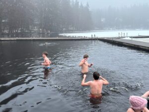 Mittag haben wir in der Schule gegessen und anschließend in Gruppen an einem Projekt über finnische und deutsche Essenskultur gearbeitet, diese haben wir aber erst am Freitag beendet. Unsere Gruppe z.B. hat ein Kahoot über typisches finnisches Essen gemacht. Später sind wir mit dem Bus zum See „Kuusijärvi“ gefahren. Dort gibt es einen großen “Saunapark” mit Hütten und dem eiskalten See zur Abkühlung zwischen den Saunagängen. Die Saunatradition ist ein wichtiger Teil der finnischen Kultur, und auch fast alle Wohnhäuser haben eine private Sauna. Wir hatten eine kleine Hütte reserviert, wo wir typische finnische Snacks essen und probieren konnten und fast alle in der Sauna waren. Als wir mit den Finnen in die Sauna gegangen sind, haben wir uns gewundert, warum sie sich auf ein Papiertuch setzten, da wir alle unser Handtuch mit reinbrachten. Es war sehr gemütlich dort. Viele von uns sind 2 mal Eisbaden gewesen ( bei -1 Grad!) , was nach etwas Überwindung ein echt tolles und besonderes Erlebnis war. Danach schmecken die Grillwürstchen besonders gut. Am Abend haben wir noch Zeit mit unserer Gastfamilie verbracht.