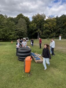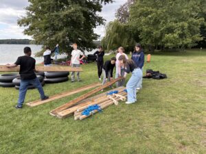 Und ich durfte hautnah den Floßbau der 7a beobachten. Bilder folgen. Es war wirklich beeindruckend, wie die Kinder zusammen gearbeitet haben und sehr erfolgreich ihre Floße durch die Fluten lenkten.