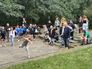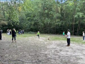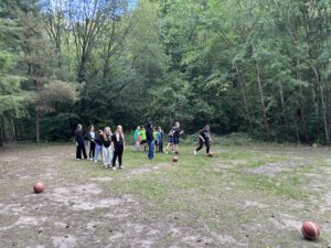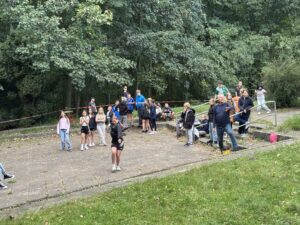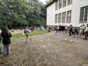 Alle satt. Alle zufrieden. Mittagspause bis kurz vor 3. Dann sammeln. Einige Kolleginnen und Kollegen haben sich ein Kennenlernprogramm ausgedacht. Nicht zum Kennenlernen der Kinder, sondern zum Kennenlernen des Objektes. Schwammausquetschen am Strand, Balancierballstäbe an der Beachvolleyballanlage, Puzzlewettrennen, Dreibeinlauf, Stiefelweitwurf, Würfeln, Basketballfußballdribbling waren die 6 Stationen, die alle durchlaufen mussten. Für Sieger gabs Süßes. Für alle anderen auch. Ich versuche, noch ein paar Bilder hochzuladen. Dann können Sie sich ein Bild machen… Mal sehen, ob es klappt.